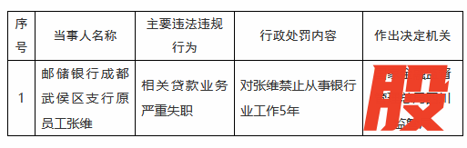 1月4日金融一线消息,国家金融监督管理总局四川监管局行政处罚信息公开表显示,邮储银行成都武侯区支行原员工张维因相关贷款业务严重失职,被禁止从事银行业工作5年。
